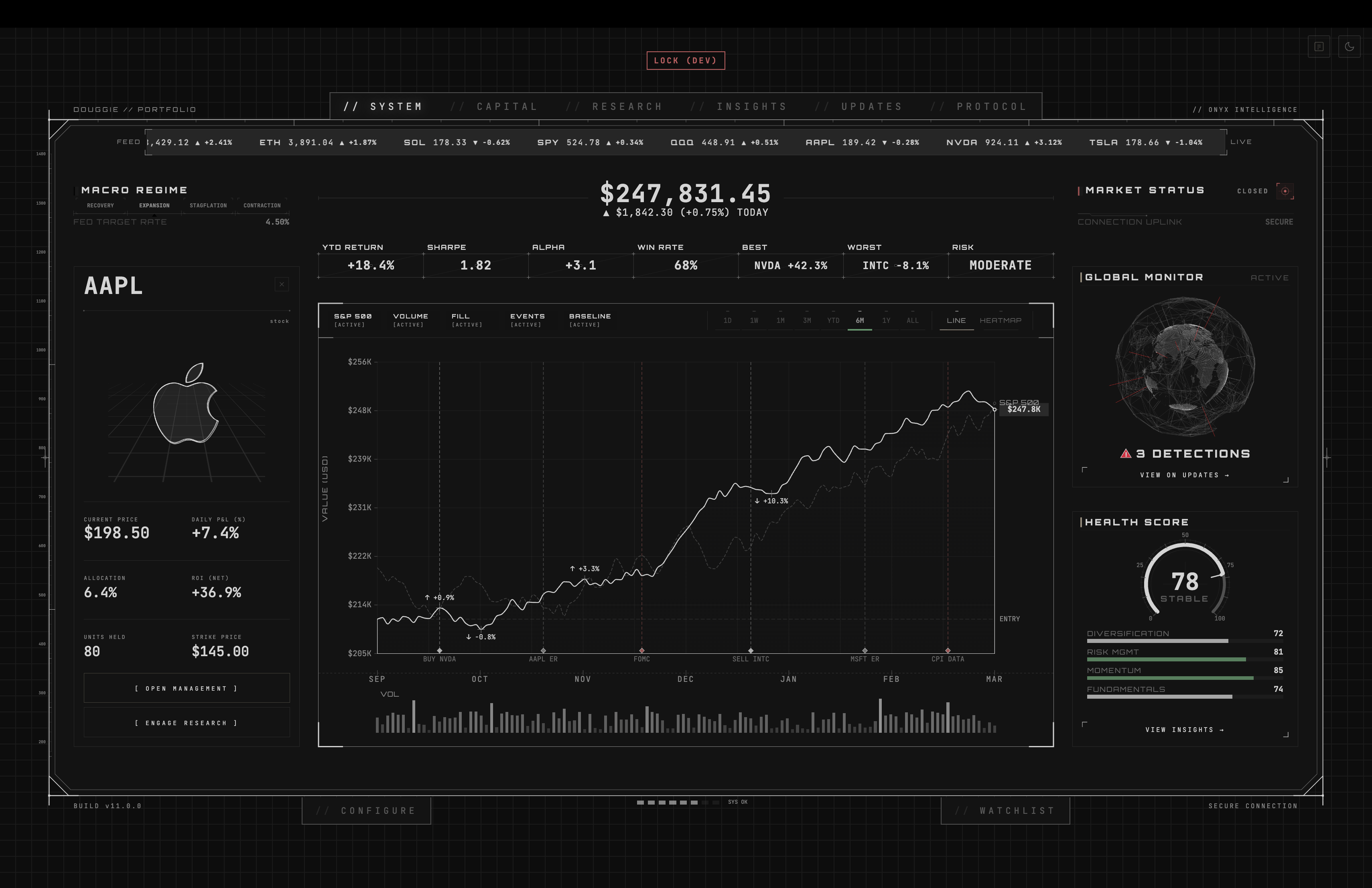 The Pro Tracker — A real-time portfolio command center. Holdings management, performance analytics, health scoring, market detection alerts, and a built-in research terminal.